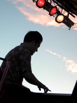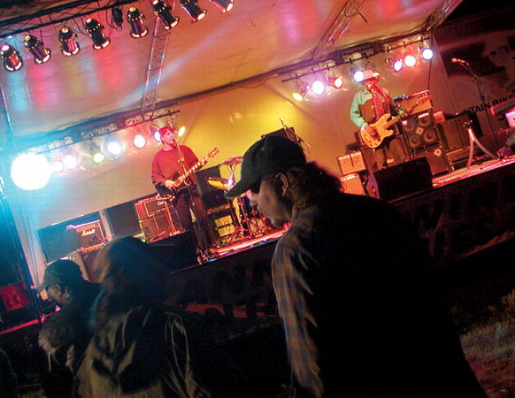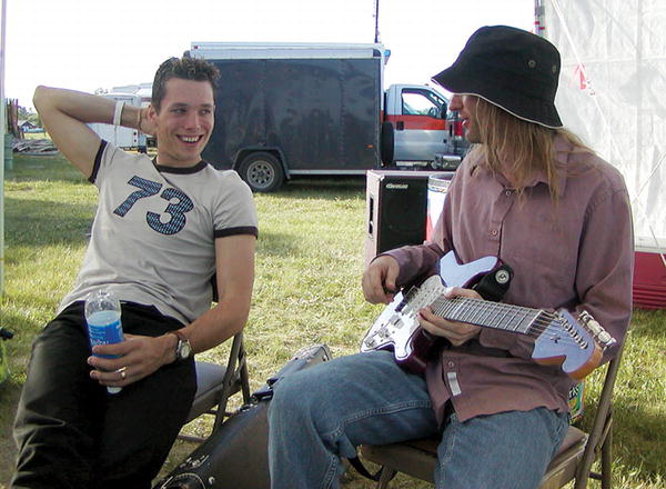 Relaxing in the V.I.P. tent is England's Aynsley Lister and lead guitarist of Blind Dog Smokin', Jason 'Twelve-fingers' Cooms relax and share a few chords with each other after their first set. Making his American debut at this year's blues fest, Lister is well known among European blues fans and was a favorite at the festival in Pinedale. |
