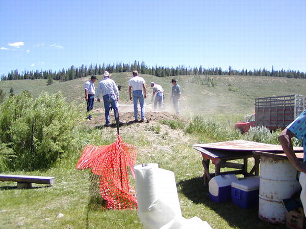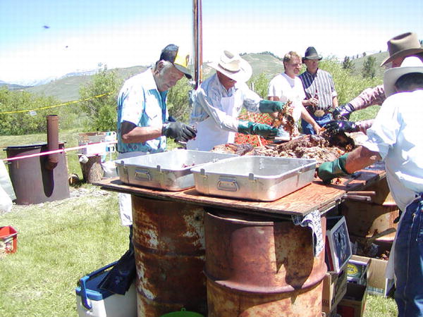 The beef, donated by the Campbell family and Wagstaff Ranches, was cooked in a huge pit, which the volunteer meat crew, Eric Schneider, Mort Yoakum, Jake Filkins, Joe Lincoln III and Tony Saunders, uncovers, enveloping the area with the savory smell of cooked beef. Flowers were donated by CK Nurseries, Kim and Marlene Stratton, firewood was donated by Tom Clover. |