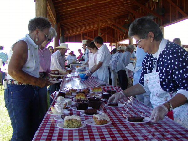 Toni Paravicini keeps the dessert table filled with a wide variety of homemade desserts as Betty Wardell and Melita Snow make their way down the chow line. |