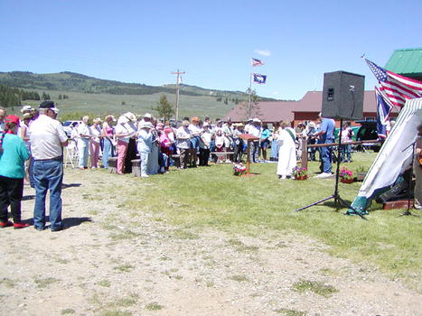 Judy Martin led the noon church service while the band Wyoming Red played for the services and the following barbecue. The services were held outside, so that people could eat in the cool shade of the church. | On 'Cue!