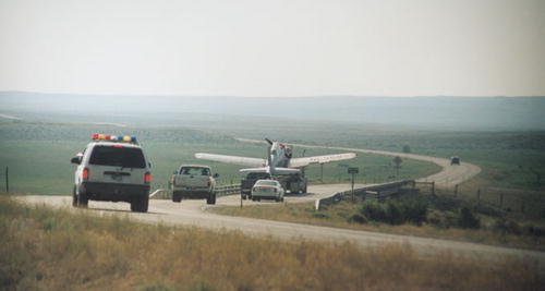 The Sublette County Sheriff's Department and Wyoming Highway Patrol provided the police escort, as seen here crossing the New Fork River bridge. Pilot and mechanic Jim McLellan said he knows of nowhere else in the country where agencies would work together to move such an aircraft down a highway for even one mile, let alone 75 miles.