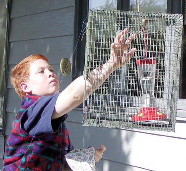 Dru Pflughoft, along with his brother, Kit, helps capture hummingbirds for Dave. The cages Dave has made are totally safe. The doors are made of soft mesh that won't damage the bird if the door shut on the bird. The doors are attached to fishing line that's used to release the doors once a hummingbird is lured into the cage. From there, the bird is gently placed into a soft bag and taken to Dave. With the help of others to do this, it saves Dave lots of time and allows him to see more birds in one day. Saturday, Kelsi and Casey Dean assisted Dave, with Casey even helping him collect data. | There are very few banders in the western states; Dave being the only one in Wyoming.