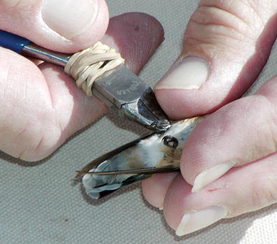 The most important step: placing the bands on those little legs is a delicate job. The bands are the same size as a small bead and must be put on just right so as not to cause irritation to the bird. |