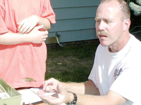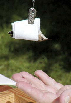 A couple of weeks ago, licensed hummingbird bander Dave Patton from Lafayette, La., visited Pinedale to collect information about the hummingbirds traveling through Wyoming as they migrate across North America. Here, Patton checks the beak for markings to indicate age of the bird. | Eye To Eye Tiny Tails to Tell by Delsa AllenAll of us in Sublette County see hummingbirds from time to time during summer months. Most of us even have a feeder or two around our houses. We may not know much about them, but enjoy watching and listening to them buzz around, especially during prime feeding times: early morning and in the evening when energy consumption is the most important. They'll arrive in mid-May and leave in the early part of September.