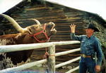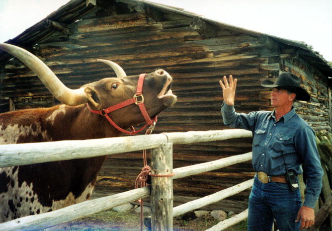 Today, the majority of Wiltshire's work is for television commercials. Most of the training occurs at his place in Dubois, called Turtle Ranch. But the performances he painstakingly creates with the help of his livestock and the creative folk that he works with have become some of the best-known commercials on television today. Wiltshire's most recent commercial is for Chevrolet and was shot with the backdrop of the old Dressler barn on the Quarter Circle Five Ranch just outside of Daniel. It is promoting the new Silverado front and rear four wheel drive pickups using longhorn cattle. The project started with a call from a creative director in Los Angeles saying something like, "What I'm thinking Robin ... I would like to have horses running ... and they turn their heads and see the Silverado ..." "They dilly dally around (with the horse idea) and then it's a cow shoot," Wiltshire explains. "Then I'd have to ask is it a cow or steer? Does it have horns or not have horns? Is it Angus, red, black, crossbred? 'Just an every day cow' they'd say." After over 40 photos and conversations back and forth, their idea of an "every-day cow" ends up being a longhorn crossbred steer with horns that aren't too long, have just the right curl but don't have a Texas flavor. Finally, when the actors have been chosen, the training can begin. Wiltshire prepares not just the selected animals or "heroes" but also a few back-ups in case disaster strikes. "I start with the halter breaking, gentle them down and grain them," explains Wiltshire. "When I'm training a horse, I'll go to the same spot every day. So once he's got the routine, then I can start taking him to different spots around the ranch." It is a slow and methodical process, adding small elements day by day. For anyone who has had to house-break a dog or train a horse, the idea of training under a tight deadline is mind-boggling. Wiltshire explains what he went through on the Pinedale shoot: "We only had, to train the steers, fourteen days. It was crazy. I was really worried because then they'd say, 'We've got to have those mouths open up and have them do this and that.' Then they're screaming to get the photographs and saying when they see them, 'Oh, they're way too wide!' They'd scrutinize over the photos and then two days before the shoot they'd say, 'First his mouth wasn't wide enough and now it's too wide!" Wiltshire remembers. "You try and explain to them that once you have them on location," Robin says with a chuckle, "these animals are trained to do specifically what you've asked for; to look around, lower their heads up and down ... you can't de-program them or throw them suddenly in the herd. These guys are the heroes, you can't change them. But they'll say, "Why can't we do that?" It is clear that Wiltshire is very patient, and not just with his animals. The director seems to always throw in something unplanned on the shoot and Wiltshire tries to anticipate that. In Pinedale, the "heroes", or steers, starring in the commercial had to pick up their heads as if they were watching the truck go by and then open their mouths as if in awe of the new vehicle. So they asked Wiltshire to have the steers pick up their heads and look to the right. "They say camera right but I know when I get to the location it could be camera left so you do both sides because they lie," he teases. The process is slow and methodical: "I'll take the longhorns and put them in a round corral and teach them to come to me. Then I'll start the hobbles, put the hobbles on his front legs and have him just stand there. Then I'll just cue him to follow me, not to move, but to follow me with the head backwards and forwards and I reward him with the grain," explains Wiltshire. In a while, he'll have them turning their heads left and right on cue. But how does he get them to open their mouths with a hand signal? "If you touch a horse just above the cheekbone, he'll lift his lip quickly and actually a steer will do the same thing. So you're touching his mouth and rewarding him for moving his mouth," Wiltshire explains. Eventually, the longhorn learns to open his mouth on cue. Over the years, Wiltshire has had a million things go wrong, like a sudden snow or so much noise that his whistle is inaudible. He's learned to train more than one hero in case the animal gets sick or isn't learning well. He tries to anticipate what the director might suddenly ask for. Sometimes he's just short of time. In those cases he's up every couple hours working with his stars until they have their parts down pat. "When he's (the steer) training, I'll get up at two in the morning and if I can get to the stables, I'll start training again until we get it right," says Wiltshire. Meanwhile, at Quarter Circle Five Ranch, Wiltshire describes the scene, "The director's going, 'how come he's not looking at the camera? Look at the camera!" Of course, the steer wasn't taught to look at the camera. The photos of the heroes in action are being reviewed and discussed. How is his expression? Is his mouth open enough? Is he looking the right way? What if we change angles? Wiltshire is protective of his animals and sometimes is forced to remind the director that they do have limits. Wiltshire says that someone representing the Humane Society is usually on the set and that comes in handy when he has to convince the director that he is asking for too much. Finally every angle has been shot, and the steers and horses have done their jobs well. It is time for Wiltshire to load them up and take them back to Turtle Ranch and give them a good meal. When he gets home, Wiltshire can expect messages on the answering machine explaining more preposterous ideas for him to bring to the viewers at home. If you're interested in seeing the finished Chevrolet commercial, it will be airing in September ... and Wiltshire's website is turtleranch.net, if you'd like to learn more. Photo credits: Leslie David See The Archives for past articl