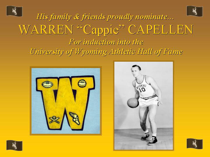 A formal nomination packet was sent by the committee several weeks ago to UW Sports Information Director Kevin McKinney at UW on behalf of the Hall of Fame selection committee. We are asking area residents to write a letter supporting Cappie's nomination and encourage his induction into the Hall of Fame. Letters are to be sent to: Rita Haws, 1908 Del Rio Drive, Kemmerer, Wyo., 83101. Rita is head of the nomination committee.
