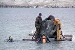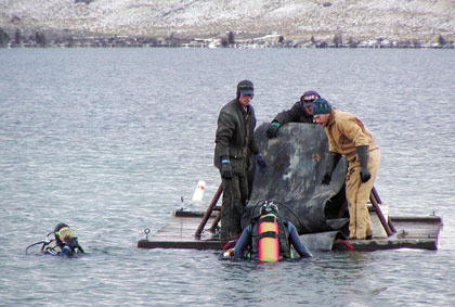 by Delsa Allen While some might debate the fact, the crew of Noble Construction hasn't lost their minds and taken to scuba diving in the freezing temperatures of Fremont Lake. Noble was awarded the contract by the Town of Pinedale to cover the town's waterline with a protective rubber mat and rocks to keep the waterline from floating to the surface again. Mark and Tom Noble have the enviable (?) job of being in the water, while Josh Stout, Stacy Illoway and Tad Essington hand them supplies. Photo credits: Delsa Allen See The Archives for past articles. Copyright © 2002 Sublette Examiner All rights reserved. Reproduction by any means must have permission of the Publisher. Sublette Examiner, PO Box 1539, Pinedale, WY 82941 Phone 307-367-3203 examiner@wyoming.com |