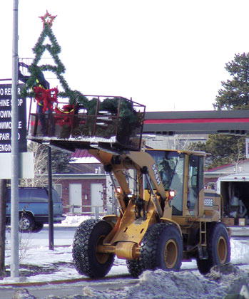 by Delsa Allen Town personnel Ron Hanson and Randy Hubbard (in loader) deck the halls in preparation for the holidays. Photo credits: Delsa Allen See The Archives for past articles. Copyright © 2002 Sublette Examiner All rights reserved. Reproduction by any means must have permission of the Publisher. Sublette Examiner, PO Box 1539, Pinedale, WY 82941 Phone 307-367-3203 examiner@wyoming.com |