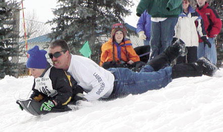 by Delsa Allen Dyson and Gil Winters slip-slide down the hill during the Pack Your Kid Up the Hill sled race at the American Legion Park in Pinedale last weekend. The contest was part of the Green River Valley Winter Carnival - for more see this week's Examiner Photo credits: Delsa Allen See The Archives for past articles. Copyright © 2002 Sublette Examiner All rights reserved. Reproduction by any means must have permission of the Publisher. Sublette Examiner, PO Box 1539, Pinedale, WY 82941 Phone 307-367-3203 examiner@wyoming.com |