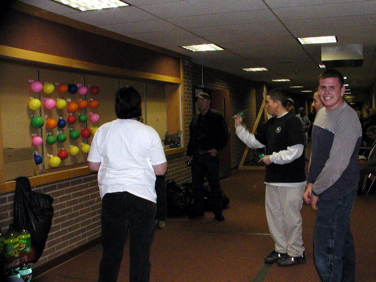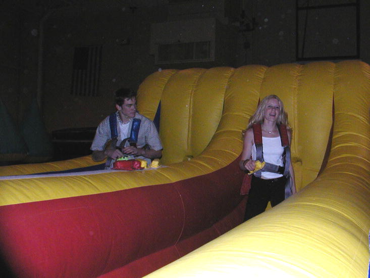 This year's party was a bit different than those of previous years. There were games, DJ's, door prizes, and to top it all off, several big inflatable obstacle courses. These included a horizontal bungee jump, a climbing wall followed by a slide, and a couple of sumo wrestling suits. The plastic suits made people much larger than normal. Students tried to force each other out of a circular ring while wearing these large suits. Plinko, Wheel of Fortune, ring toss, golf and darts were included in this year's game booths. Plenty of prizes were won, including candy, pop and even cash.