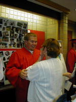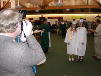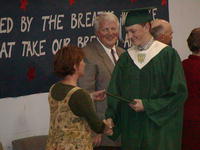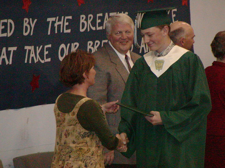 Click for larger view School District No. 1 teacher Ann Bennett is fortunate to be able to present her senior son Andy with his diploma during Pinedale High School's graduation. PHS Principal Dick Kennedy also congratulated the seniors as they crossed the stage. |