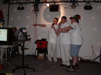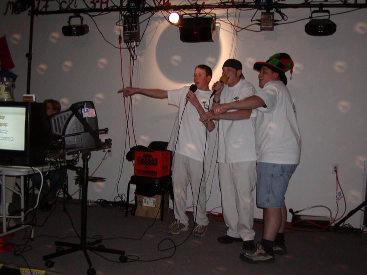 Click for larger view Ryan Schaefer, Jesse Ellis and Travis Lanning take their turn at the karaoke mike to earn $20. The party was held at the Pinedale Entertainment Center, where students watched movies, bowled and played pool. |