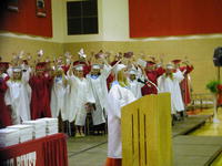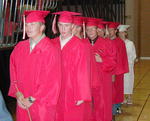Click for larger view BPHS senior boys wear the traditional red graduation gowns on their walk to their seats Wednesday evening, their female counterparts wear white graduation gowns. |