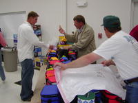 Click for larger view PHS foreign exchange student Daniel Costa and his host parent Barry Johnson look over the items each senior received for attending the all-nighter. |