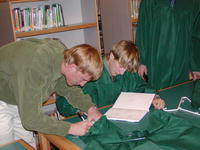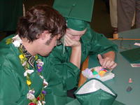 Click for larger view Morgan Malkowski and Wyatt Sheppard take a few minutes before the final ceremonies to leave messages for all time in yearbooks and graduation caps. |