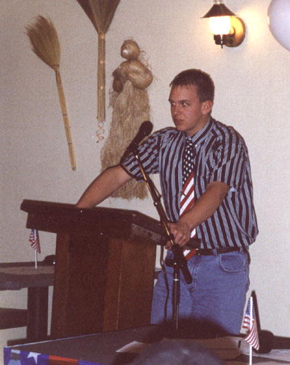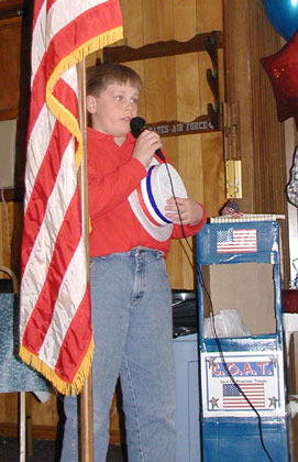Sublette County Christian School student Phillip Loftus recites "Our Flag" during the Pinedale rally at VFW Post 4801. | • Chap Stick