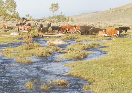 by Rhonda Swain The first herd of Upper Green River Cattle Association cattle trek across the bridge on Marsh Creek Sunday after being tallied through the counting gate. Cattle belonging to UGRCA members are making their way to summer pasture on the Bridger-Teton National Forest, where they will stay till mid- to late-July, when they will be moved to new grazing areas. They will drift home around Oct. 1. See The Archives for past articles. Copyright © 2002, 2003 Sublette Examiner All rights reserved. Reproduction by any means must have permission of the Publisher. Sublette Examiner, PO Box 1539, Pinedale, WY 82941 Phone 307-367-3203 examiner@wyoming.com |