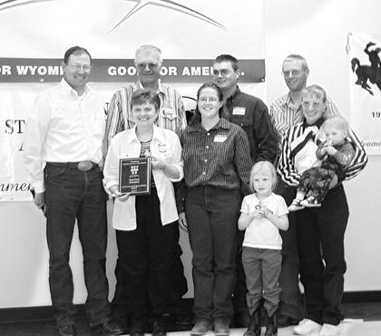 Sublette Examiner Volume 3, Number 13 - June 26, 2003 brought to you online by Pinedale Online by Cat Urbigkit About 130 people drove from all corners of the state Wednesday to converge on Pinedale to celebrate a family's history of environmental stewardship. The Wyoming Stock Growers Association tapped the Joel and Susan Bousman family as the 2003 Environmental Stewards for their East Fork Livestock operation in the Boulder area of southern Sublette County. Joel Bousman is a leader in the agricultural industry, serving on various boards, testifying before our nation's Congress when needed and taking the initiative to help create a voluntary permittee-monitoring program for the Silver Creek Common Allotment. The voluntary permittee monitoring on Forest Service allotments helps the permittees identify and solve ecological concerns on the allotments, document their stewardship for their official allotment file, and allows the use of sound science to benefit the range, according to Sublette County Extension Agent Eric Peterson. Results of the monitoring effort have been significant, according to Joel Bousman. Cattle distribution has improved, the cattle have increased in performance (including health, weight and condition), and the association has been granted an extension of two weeks on the cattle grazing season on their national forest allotment, which rings in with about a $5,000 savings to the permittees. "We have been able to document our stewardship," Bousman said, in addition to building trust and communication among all parties, as well as public and agency education and permittee education. Wednesday's celebration included a half-day of presentations about the family and its ranch operation, and then participants loaded into buses to tour the ranch before returning to Pinedale for a fabulous meal and awards presentation. The Bousman family history goes back six generations in Sublette County, beginning with Knute Jomen's settlement of the East Fork River country in the late 1880s. The family began its cattle outfit then, and it's a thriving business enterprise today. East Fork Livestock is a Hereford-based cattle outfit, running both cows and calves and yearlings. Heifers begin calving in late March on private ranch lands, followed by the mother cows in mid-April. Joel and Susan Bousman's son Jim described the cycle encountered throughout the year in the cattle ranching operation. After calving, community brandings occur in May, with the assistance of neighbors being an important component in the operation. The cattle head to desert allotments administered by the Bureau of Land Management in first week in May, for a 45-day grazing season, then move onto mountain allotments on the Bridger-Teton National Forest. This gives the hay meadows on the private ranchlands along the East Fork River a seasonal rest from grazing pressure. "They (the cattle) need to stay off it all summer so we can grow some hay," Jim said, adding that the key factor in making that happen is good management on the national forest allotment. "The key to good management is through good distribution," Bousman said, noting that spreading the cattle out on the allotment allows these grazers to utilize the resource in an efficient manner. Three or four range riders are hired to move the cattle and keep them spread out in this 38,000-acre allotment of rough mountain country, most of which falls within designated wilderness area. Home ranches must produce hay in order to get the cattle through those snowy Sublette County winters. This forage production is entirely dependent upon irrigation water. "If we don't have irrigation water, we're in trouble," Bousman said, adding that water is the lifeblood of the operation. Flood irrigation via a diversion from the East Fork River allows the ranch meadows to be irrigated from about June 10 to July 10, when the river level drops too low to divert an adequate amount of water. "We don't have any storage on the East Fork River," Bousman explained. The use of flood irrigation (rather than sprinklers or pipe systems) is an efficient system for the ranch ecosystem, Bousman said. Early flows provide for raising the water table, ensuring moisture for later in the season. "If you can't get the sub up, you can't grow any hay," Bousman said. This serves as a type of underground water storage, bringing the water table to the surface, which then serves to recharge the river throughout the year, providing for the maintenance of the fishery. Haying begins July 20 and generally lasts through to end of August. It's a family undertaking, with even the kids getting involved, as well as an Amish family that arrives from Pennsylvania to help in the harvest. When the temperatures in the high country begin to get a little nippy and storm clouds hover, the cows begin their drift south to home ranges, generally in mid-September. The Bousman cattle are mixed with those belonging to other cattle outfits in the association, so they must be sorted and herded to their home meadows. Once again the neighbors are an important factor in getting the job done. Fall grazing occurs on the ranch's private pastures with some state leases being used as well. Yearlings are shipped in the fall, and busy days are spent preg-testing, weaning, vaccinating and culling. Things settle down as winter begins, with daily feeding of hay beginning in December, but sometimes as early as Thanksgiving. The cattle are put on full feed from the back of a wagon through calving, when the cycle begins anew. Joel Bousman said he knows of no stronger incentive to take care of the land than to know that your family's future depends on it: "God bless Wyoming and keep it wild." Photo credits: Cat Urbigkit See The Archives for past articles. Copyright © 2002, 2003 Sublette Examiner All rights reserved. Reproduction by any means must have permission of the Publisher. Sublette Examiner, PO Box 1539, Pinedale, WY 82941 Phone 307-367-3203 examiner