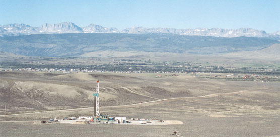 by Cat Urbigkit Natural gas development along the Pinedale Anticline continues at a rapid pace this summer, with this drilling rig located just outside the town limits, along the Mesa Road. The Town of Pinedale is in the center of the picture, with Fremont Peak and the Wind River Mountains in the background. Photo credits: Cat Urbigkit See The Archives for past articles. Copyright © 2002, 2003 Sublette Examiner All rights reserved. Reproduction by any means must have permission of the Publisher. Sublette Examiner, PO Box 1539, Pinedale, WY 82941 Phone 307-367-3203 examiner@wyoming.com |