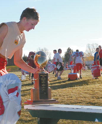 by Delsa Allen Big Piney Puncher Seth Linn grabs the Sublette County Bowl trophy after the Punchers won last Friday's game at Pinedale's Korfanta Field. Photo credits: Delsa Allen See The Archives for past articles. Copyright © 2002, 2003 Sublette Examiner All rights reserved. Reproduction by any means must have permission of the Publisher. Sublette Examiner, PO Box 1539, Pinedale, WY 82941 Phone 307-367-3203 examiner@wyoming.com |