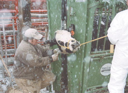 by Cat Urbigkit Tim Weatherby of USDA Animal and Plant Health Inspection Services - Veterinary Services in Blackfoot, Idaho, draws a blood sample from the neck of a cow for brucellosis testing on Sunday. Photo credits: Cat Urbigkit See The Archives for past articles. Copyright © 2002, 2003 Sublette Examiner All rights reserved. Reproduction by any means must have permission of the Publisher. Sublette Examiner, PO Box 1539, Pinedale, WY 82941 Phone 307-367-3203 examiner@wyoming.com |
