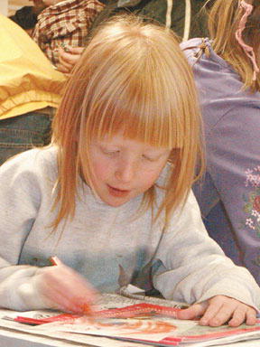 by Delsa Allen Four-year-old Brittney Hill traces some bunny artwork at the Kids' Christmas Party at the Sublette County Library in Pinedale Saturday evening after the parade. Brittney was just one of many kids who showed up for the fun-filled event. See The Archives for past articles. Copyright © 2002, 2003 Sublette Examiner All rights reserved. Reproduction by any means must have permission of the Publisher. Sublette Examiner, PO Box 1539, Pinedale, WY 82941 Phone 307-367-3203 examiner@wyoming.com |