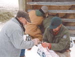 by Cat Urbigkit Gary Zakotnik of the Wyoming Livestock Board assists Dean Clause of the Wyoming Game and Fish Department in handling vials of blood drawn from elk at the Muddy Creek elk feedground last week. Four of the 15 elk tested positive for brucellosis. Photo credits: Cat Urbigkit See The Archives for past articles. Copyright © 2002, 2003, 2004 Sublette Examiner All rights reserved. Reproduction by any means must have permission of the Publisher. Sublette Examiner, PO Box 1539, Pinedale, WY 82941 Phone 307-367-3203 examiner@wyoming.com |