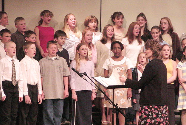 by Delsa Allen Gena Anderson directs the Pinedale Middle School choir during the all-choir concert held at the Pinedale Auditorium last Tuesday evening. Both the high school and middle school choirs performed. Photo credits: Delsa Allen See The Archives for past articles. Copyright © 2002 Sublette Examiner All rights reserved. Reproduction by any means must have permission of the Publisher. Sublette Examiner, PO Box 1539, Pinedale, WY 82941 Phone 307-367-3203 examiner@wyoming.com |