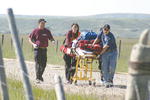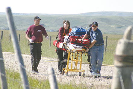 by Delsa Allen Pinedale Emergency Medical Technicians bring a stretcher to injured students during a mock accident last week involving a School District No. 1 school bus and a propane truck. The exercise was organized by the school in conjunction with the Sublette County Sheriff's Office, Pinedale EMS and the Pinedale Volunteer Fire Department. Photo credits: Delsa Allen See The Archives for past articles. Copyright © 2002, 2003, 2004 Sublette Examiner All rights reserved. Reproduction by any means must have permission of the Publisher. Sublette Examiner, PO Box 1539, Pinedale, WY 82941 Phone 307-367-3203 examiner@wyoming.com |