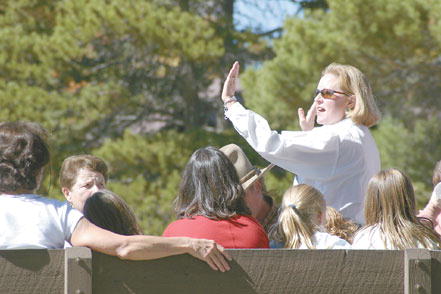 by Delsa Allen Local historian Ann Noble leads a tour group through the first four blocks of Pinedale Saturday afternoon via horse team and wagon. The tour was sponsored by the Sublette County Historic Preservation Board and was part of Pinedale's 100th birthday celebration. Photo credits: Delsa Allen See The Archives for past articles. Copyright © 2002, 2003, 2004 Sublette Examiner All rights reserved. Reproduction by any means must have permission of the Publisher. Sublette Examiner, PO Box 1539, Pinedale, WY 82941 Phone 307-367-3203 examiner@wyoming.com |