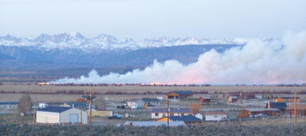 by Deanne Swain Meadows were set fire in a controlled burn that was conducted Sunday on the former Tyler Ranch west of Pinedale. Although it looks out-of-control, the smoke and flames were non-existent by Monday. Photo credits: Deanne Swain See The Archives for past articles. Copyright © 2002, 2003, 2004 Sublette Examiner All rights reserved. Reproduction by any means must have permission of the Publisher. Sublette Examiner, PO Box 1539, Pinedale, WY 82941 Phone 307-367-3203 examiner@wyoming.com |