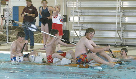 The Pinedale Middle School eighth-grade exploratory class compete in the second annual Exploratory Milk Carton Boat Races in the Pinedale pool. The students designed and built the boats themselves. Photo credits: Mitch Irrgang See The Archives for past articles. Copyright © 2002, 2003, 2004 Sublette Examiner All rights reserved. Reproduction by any means must have permission of the Publisher. Sublette Examiner, PO Box 1539, Pinedale, WY 82941 Phone 307-367-3203 examiner@wyoming.com |