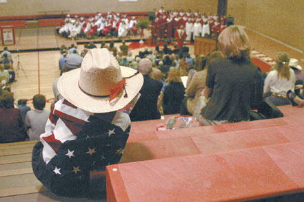 by Delsa Allen Tate Johnson watches the graduation ceremonies for the 2004 class of Big Piney High School. Amanda Blair and Gordon Sawyer earned valedictorian and salutatorian honors out of the class consisting of 39 seniors. Photo credits: Delsa Allen See The Archives for past articles. Copyright © 2002, 2003, 2004 Sublette Examiner All rights reserved. Reproduction by any means must have permission of the Publisher. Sublette Examiner, PO Box 1539, Pinedale, WY 82941 Phone 307-367-3203 examiner@wyoming.com |