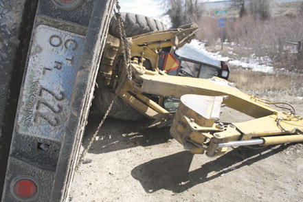 by Delsa Allen Tuesday, a trailer loaded with a county backhoe tipped over just off U.S. Highway 191 onto South Bench Road. Luckily, little damage was done to the equipment. Photo credits: Delsa Allen See The Archives for past articles. Copyright © 2002-2005 Sublette Examiner All rights reserved. Reproduction by any means must have permission of the Publisher. Sublette Examiner, PO Box 1539, Pinedale, WY 82941 Phone 307-367-3203 examiner@wyoming.com |
