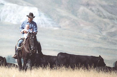 by Cat Urbigkit Jim Jensen takes his young son, seven-month-old Ethan, out on a recent cattle drive. The Jensen family was moving their Lucky 7 Angus bulls from pastures near Highway 351 and the New Fork River. Photo credits: Cat Urbigkit See The Archives for past articles. Copyright © 2002-2005 Sublette Examiner All rights reserved. Reproduction by any means must have permission of the Publisher. Sublette Examiner, PO Box 1539, Pinedale, WY 82941 Phone 307-367-3203 examiner@wyoming.com |