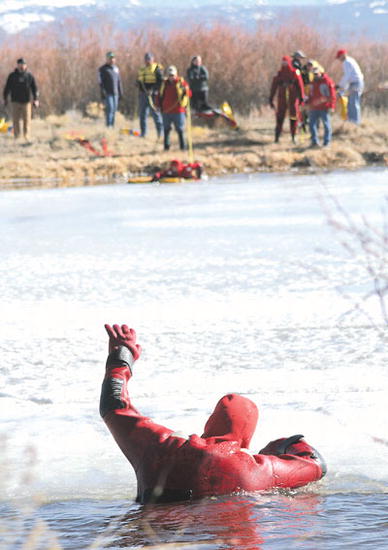 by Delsa Allen Sublette County Tip Top Search and Rescue members gathered around, and in, an icy pond outside of Pinedale last Saturday for ice rescue training. Photo credits: Delsa Allen See The Archives for past articles. Copyright © 2002-2005 Sublette Examiner All rights reserved. Reproduction by any means must have permission of the Publisher. Sublette Examiner, PO Box 1539, Pinedale, WY 82941 Phone 307-367-3203 examiner@wyoming.com |
