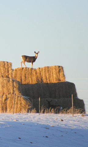 by Carie Whitman Is that a deer on a haystack? How did he get up there? I didn’t know they could climb! This deer and her family stopped in the Bray Ranch for a fine dinner. Photo credits: Carie Whitman See The Archives for past articles. Copyright © 2002-2006 Sublette Examiner All rights reserved. Reproduction by any means must have permission of the Publisher. Sublette Examiner, PO Box 1539, Pinedale, WY 82941 Phone 307-367-3203 examiner@wyoming.com |