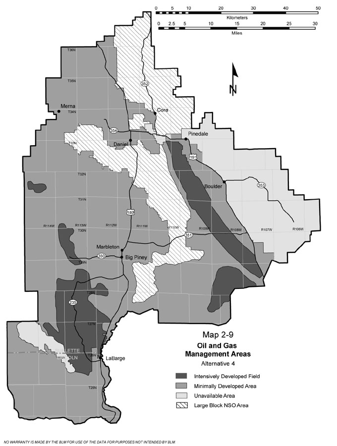 • Alternative One – continuation of existing management as described in the 1988 RMP. • Alternative Two – maximize oil and gas resource production while providing an adequate level of environmental protection for other resources. • Alternative Three –provide the maximum level of environmental protection for all competing resources while allowing for the production of oil and gas resources. • Alterative Four, Preferred Alternative – optimize production of oil and gas resources while providing the appropriate level of environmental protection for all competing resources. A facet of the BLM’s new performance-based planning approach includes dividing the planning area into several management “sections.” Each section would have different goals for managing oil and gas production and conserving wildlife habitat. One section would focus on maximizing the recovery of oil and gas while conserving wildlife habitat as feasible and promoting reclamation of affected habitats. A second section would be available for oil and gas leasing, with strict limits on development at the exploration stage to conserve wildlife habitat and other resources. A third section would be unavailable to oil and gas leasing. Finally, a fourth section would be available for oil and gas leasing, with stipulations prohibiting surface occupancy by oil and gas operators. The proposal: Alternative 4 would make available approximately 1,024,880 acres for oil and gas leasing and development. The 7,136 wells projected under this alternative would potentially extract 19,168 BCF of natural gas and 150 million barrels of oil during the life of the plan. The planning area would be divided into four areas for management of oil and gas leasing and development. Intensively Developed Fields encompassing about 175,750 acres would be managed for intensive oil and gas activities while protecting wildlife habitats to the extent practicable. Minimally Developed Areas (672,470 acres) would be managed for protection of important values during oil and gas exploration, but would provide opportunity for intensive oil and gas activities. Large Block NSO Areas (205,100 acres) would be managed for protection of wildlife habitats through offering oil and gas leases with “no surface occupancy” stipulations. Unavailable Areas (156,900 acres) would be managed for protection of wildlife habitats through indefinitely postponing the availability of lands for oil and gas leasing. About 14,000 acres, including Trapper’s Point, New Fork Potholes, CCC Ponds and the East Fork River Unit, would be withdrawn from locatable mineral entry. The current permitted animal unit months for livestock grazing would be maintained unless monitoring indicates a need for adjustment. OHV use in the Desert General Use area would be limited to existing roads and trails. Special Management Areas The Rock Creek and Beaver Creek areas of critical environmental concern would be retained, while new ACECs would be designated in the Trapper’s Point and New Fork Potholes areas. Other special management areas would be designated and would include the Miller Mountain, Ross Butte, and Wind River Front areas, encompassing 303,350 acres. Four river units would be managed as suitable for inclusion in the Wild and Scenic River System: East Fork, Scab Creek, Silver Creek, and the upper Green River. Socio-Economics According to the EIS, under the preferred alternative, the pace of gas development and production would be expected to be very similar to the current management situation, with a 181 percent increase in the number of wells between 2006 and 2020. Over the 20-year study period, employment would be expected to average more than 10,000 direct, indirect, and induced jobs per year, which would be slightly less than under current management. Slight declines in employment would be expected as slightly less oil and gas development would be permitted, while increases in recreational activities would be expected to have a small impact on employment. Regional incomes under the preferred alternative would be expected to be slightly higher in the study area compared to now, rising to exceed $6.9 billion. Quality of Life Overall, BLM management under the preferred alternative would cause dissatisfaction among individuals and groups that were displaced by development activities, the EIS predicts. Some stakeholder groups, such as conservationists, nonmotorized recreational groups, and other wildlife protection groups, would likely perceive a decreased quality of life as a result of well drilling and field development. “In some cases, these groups might experience long-term impacts from a loss of open landscapes and solitude as a result of development activities’ use of the planning area,” according to the EIS. “However, others in the community, such as local business interests, long-term residents, and local and state government representatives, might support further development activities, which they might feel increase the economic and cultural diversity of the area and increase the overall standard of living.” See The Archives for past articles. Copyright © 2002-2006 Sublette Examiner All rights reserved. Reproduction by any means must have permission of the Publisher. Sublette Examiner, PO Box 1539, Pinedale, WY 82941 Phone 307-367-3203 examiner@wyoming.com |