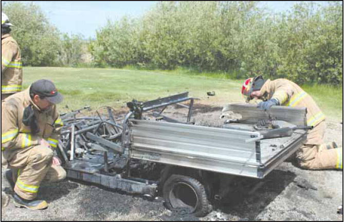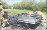 by Christi Marsico Pinedale volunteer firefighters Don Duerr (left) and Kelly Tegeler inspected this charred utility cart that caught fire Wednesday morning at Rendezvous Meadows Golf Course. Photo credits: Christi Marsico See The Archives for past articles. Copyright © 2002-2006 Sublette Examiner All rights reserved. Reproduction by any means must have permission of the Publisher. Sublette Examiner, PO Box 1539, Pinedale, WY 82941 Phone 307-367-3203 examiner@wyoming.com |