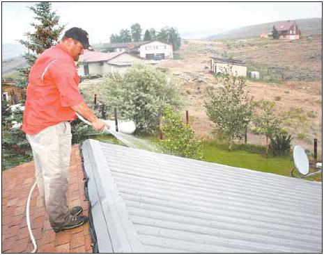 by Trey Wilkinson Ron Brown, a 25-year Pinedale resident, stood atop his roof July 12 hosing down his house while running sprinklers soaked his lawn with water throughout the evening in case the Pole Fire climbed over the hill and onto his property. Photo credits: Trey Wilkinson See The Archives for past articles. Copyright © 2002-2007 Sublette Examiner All rights reserved. Reproduction by any means must have permission of the Publisher. Sublette Examiner, PO Box 1539, Pinedale, WY 82941 Phone 307-367-3203 examiner@wyoming.com |