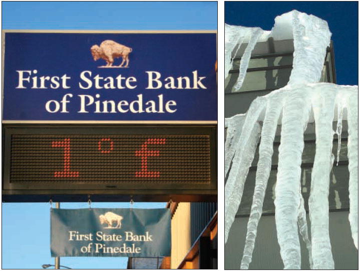 by Trey Wilkinson Temperatures dropped into the -20s Tuesday morning; in fact, -26 was recorded at the Pinedale Ralph Wentz Field around 6 a.m. Tuesday, which was the lowest temperature of the 2007-08 winter season. Surrounding areas saw even colder temperatures. By Wednesday morning, the bank sign on Pine Street shows a heat wave is passing through as temperatures soar to above zero. Photo credits: Trey Wilkinson See The Archives for past articles. Copyright © 2002-2008 Sublette Examiner All rights reserved. Reproduction by any means must have permission of the Publisher. Sublette Examiner, PO Box 1539, Pinedale, WY 82941 Phone 307-367-3203 examiner@wyoming.com |