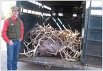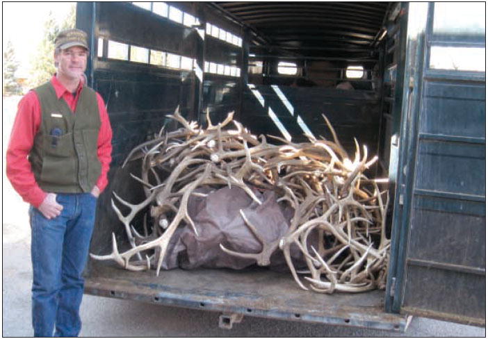 by Joy Ufford Wyoming Game and Fish’s Gary Hornberger of Pinedale finishes loading 440 pounds of shed elk antlers collected by winter feeders from their respective Sublette feedgrounds. These will be combined with another 1,210 pounds of antlers – a horse-trailer-full – collected from Hoback Basin, Teton and Lincoln feedgrounds, making the G&F haul heading up to Jackson for Saturday’s Elk Antler Auction a record-setting 1,653 pounds. Proceeds benefit the National Elk Refuge pellet-feeding program. Hornberger said the old record was 1,403 pounds and attributed the antler-collecting success to the late spring keeping elk on feedgrounds longer where their shed antlers were easier to find. Photo credits: Joy Ufford See The Archives for past articles. Copyright © 2002-2008 Sublette Examiner All rights reserved. Reproduction by any means must have permission of the Publisher. Sublette Examiner, PO Box 1539, Pinedale, WY 82941 Phone 307-367-3203 examiner@wyoming.com |