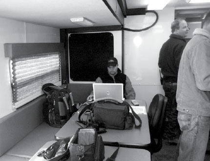 The mapping system can also be used to chart wild fires and wind directions. Knowing wind patterns can help emergency workers battle fires and hazmat situations. When officers know which way a plume of toxic smoke will blow, they can better control the accident and protect surrounding communities. The mobile command center also possesses internet access and two cell phones serviced by a large satellite dish. Network access should be very reliable. Hanson said, “If we can see the sky, we can talk.” Hanson said the facility would fulfill a real need in the county’s emergency response system. He estimated that the county’s search and rescue division was deployed about 37 times over the past year. While looking for Ken Koski, a backpacker who died in the Wind River Range in September, rescuers worked out of a converted ambulance.