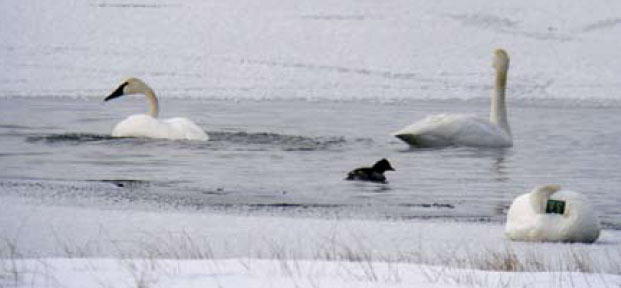 The group broke up in order to cover eight routes all of which were within a 15-mile radius of Pinedale. Mayor Steve Smith took the route through the Mesa looking for winter raptors (hawks, owls, and eagles). His two most interesting birds were a kingfisher and an American Dipper. “It’s a great community event,” Mayor Smith said. Fred Pflughoft and his family took the route covering the city parks, as well as another route to Soda Lake. Jeff and I happily took a route that was new to us. 40 Rod Road to part of the Pape Road and then 191 back to the Cora turnoff. Jeff drove and I scanned the sky. Traffic was light, thankfully. Every so often one of us would say “Corvid on the left” or “is that a Buteo,” and we would stop to check the bird out with the binoculars or the spotting scopes. We saw the common birds, raven, magpies, and mallard ducks, and dutifully recorded the number of birds we spotted. But we also saw twenty Trumpeter Swans, mostly sleeping but occasionally bathing, one dark morph Rough Leg Hawk (a color I had never seen before), a flock of about 50 Rosy finches (being eagerly stalked by the cats), six Bald eagles, a kingfisher, a flicker, and a Northern Shrike.