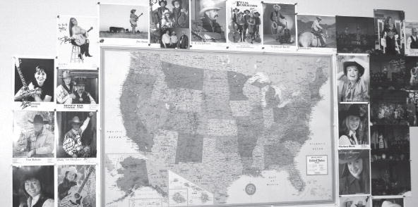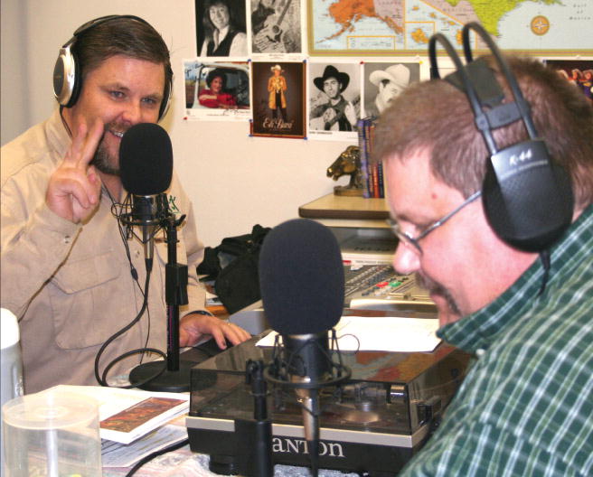 by Nikki Mann Brothers Andy and Jim Nelson sit in their other office, a back room in Andy’s Chiropractic Center where they run their second, award-winning job. One wall is covered in pictures and a map, the Wall of Fame. Pins on the map mark radio stations where their show, Clear Out West (COW) is aired. Pictures of cowboy and cowgirl poets, musicians and other talents surround the map. A simple table is covered with mixing and recording equipment and two large microphones. Andy was named male cowboy poet of the year by the Western Music Association. He and Jim also received the DJ of the year award again for the second year. Every Tuesday night, the brothers get together to record and edit their one-hour radio show. They kept their microphones turned off while they revealed a little about themselves, a lot about the bloopers they’ve edited out, and what they hope to do with their radio show.