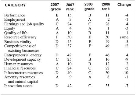 Nonprofit organization releases 2007 development report card for states by Nikki Mann The recently released 2007 development report card from the Corporation for Enterprise Development (CFED) highlighted serious shortcomings and strengths for the state. A release by the CFED highlighted some of its more interesting findings. Among the findings was the conclusion that Wyoming lacks a balanced economy. The state has a high employment demand but “fairly low job quality.” The average annual pay was also low (42nd in the nation) and the jobs were less likely to provide health benefits(35th). However, the state had a high quality of life with moderately low rates of heart disease (14th) and infant mortality (16th) coupled with a better than average home ownership rate (18th). The state also ranked well in parts of education, with a high investment and great outcomes in grades K-12, but very low rates of students attending college. Wyoming again ranked the worst in the nation for resource efficiency; an F for 50 out of 50 states. This is the 20th Development Report Card of the states by the nonprofit corporation CFED, whose goal is to expand economic opportunity. The states received overall ranking in three general categories. Wyoming got a B in “performance,” a C for “development capacity” and a dismal D for “business vitality.” The three general categories were further broken down into 15 more specific categories. Among Wyoming’s achievements was an A in employment with a ranking or 3rd out of 50 states in the nation. Wyoming also received an A in equity, ranking 4th, and an A in amenity resources and natural capita, ranking 9th. The state achieved two more A’s in quality of life and human resources, both ranking 10th. Wyoming’s worst grade was an F in resource efficiency and a ranking of 50th. The state also did poorly in business vitality, ranking 45th with a D. Innovation assets made the D cutoff, ranking 42nd, but dropped 7 state rankings from the previous year. Infrastructure resources also fell in the state rankings by 10 places from the previous year, giving it a D and ranking Wyoming 40th. Entrepreneurial energy, while receiving a D and only ranking the state 42nd in the nation, at least gained 4 ranks from the previous year. Competitiveness of existing businesses almost made the cutoff for a better grade, but not quite. Wyoming received a D in that category as well, ranking it 37th in the nation, but was up 12 ranks from the previous year. The grades for the 15 categories were based on a study that used 67 measures to asses the economy’s performance for both citizens and business, and to evaluate how well the state is situated for the future. Among the more interesting results of the study’s 67 measures was the fact that Wyoming generated the highest amount of greenhouse gas emissions and had the most vehicle miles traveled of any state. The state also came in a failing 49th for per capita energy consumption, 47th for the rate of recycled waste and 43rd on the toxic release inventory, leaving no doubt as to why Wyoming failed the resource efficiency section. Many sections had dramatic differences between their results. In competitiveness of existing businesses, Wyoming ranked 3rd for manufacturing investments, but 49th for industrial diversity. The difference in the human resources section between high school attainment (3rd) and college attainment (44th) was equally as stark. Wyoming did not fail to exhibit this same contrast in infrastructure resources. The state ranked a respectable 10th in highway performance, but again bottomed out at 50th place in electronic public services. For a complete report card, please visit www.cfed.org/go/drc. See The Archives for past articles. Copyright © 2007 Pinedale Roundup All rights reserved. Reproduction by any means must have permission of the Publisher. Pinedale Roundup, PO Box 100, Pinedale, WY 82941 Phone 307-367-2123 editor@pinedaleroundup.com |