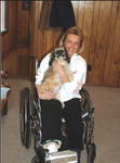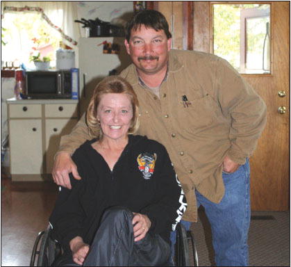 “I was right next to her on my bike when it happened,” the soft-spoken Howell said last week. “She hit hard. It happened so fast. I wrapped my shirt around her left leg. “I thought she would lose both her legs. I wish we hadn’t got that motorcycle.” The new Harley had stalled out and Tammy said she overcompensated when she restarted it. The bike went flying into Pine Street, Pinedale’s main drag, and smashed into a passing semi trailer truck. Quick work by retired nurse Marilyn Huffman at the scene probably saved her life. She was transported to the Pinedale Clinic — treated there by Huffman and nurse Abe Keating — and then life-flighted to the University of Utah hospital in Salt Lake City. Tammy was in intensive care for nine days and hospitalized for 34 days. She had 13 surgeries and almost lost her foot. “I’m not a real religious person, but God was looking down on me,” she said from her home last week, her little dog Harley in her lap. “Thank God for the people at the Pinedale Clinic and the University of Utah. And thank God for modern technology.” To make matters worse, their hot water heater at home broke a few days after the accident while they were in Salt Lake City and flooded their basement, where many of their possessions were stored. But then the little town of Pinedale showed its big heart. Donations poured in from everywhere. Volunteers watched and worked on the house. On her first day out after leaving the hospital, Doug pushed Tammy in her wheelchair down Franklin, past the tragic site, then down Pine Street and into the Corral Bar. The tears and beers flowed as Tammy was greeted with hug after hug after the warmest of hugs. “Oh, that felt so good,” she said with a smile. “A lot of people I didn’t even know were coming up to me. “Pinedale is just full of wonderful and generous people. I can’t thank everyone enough.” This was the second brush with death for the 5-foot-2, 120-pound Burns. In 1987 she was hit head-on by a drunk driver back in Ohio. “I was trapped inside a burning car and in a wheelchair for nine months, and on crutches for 16 months,” she said. “It broke my arm and shattered my leg.” Now a few more surgeries and physical therapy lie ahead. The house on Franklin has been outfitted with a ramp and the bathroom refitted. “I’m getting around good and bathe myself,” she said with a smile. “Doug told them after the wreck that she’s strong and strong willed. I’ll walk and work again. “But no one wants to go through what I went through once, let alone twice.” Doug bought a van so she could ride comfortably to and from Salt Lake. He fixed up the house and never left her side. “It’s been a big change, but she would do it for me,” he said with a smile. Tears welled in Tammy’s soft blue eyes. “Doug has been standing by me every day,” she said. “I love him so much.” Thanks to everyone!