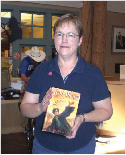 by Mary Billiter Potter-mania swept through Pinedale last weekend, with the release of “Harry Potter and The Deathly Hallows.” The final book in the series arrived at the Sublette County Library in Pinedale just in time for eager reading fans. “I heard it was supposed to be good,” said Dustin Timm. The 11-year-old was one of the first patrons to visit the library Saturday morning. “I was hoping to maybe check it out,” he said when he eyed the six copies on the front desk. Timm will get his chance after the 12 patrons on the waiting list read it first. “People started calling in January to get on the list for this book,” said librarian Jenny Gunn, who admitted she was surprised the list wasn’t longer. “I think a lot of people buy their own copy because they can’t wait,” she said and then smiled a bit embarrassed. “My book came in this morning’s mail. I ripped the box open on my way in. I wanted to have something to start reading this afternoon at lunch.” Gunn is not alone in the anticipation of reading Harry’s final goodbye. The boy wizard has captivated worldwide attention since its debut in 1990. Author J.K. Rowling told the Associated Press that two major characters will die and has begged the public not to give away the ending to her seventh and final Potter book. That hasn’t stopped readers from speculating. “I think Dumbledore and maybe Ron (Weasley) die, but I’m not sure,” said Timm. The future sixth grader was hopeful the series wouldn’t end with Harry’s demise. “I don’t think the author would do that to us.” A sentiment echoed by Gunn. “I really don’t want it to be Harry. That would be a really bad ending.” The librarian offered her prediction. “I think it’ll maybe be Snape and probably the young Malfoy.” Middle-school counselor Jim Mahaffey didn’t weigh in on the demise. He leaves that for his students. “The kids were reading Harry Potter and talking about them so I started, then I got hooked.” Mahaffey called Pinedale home for two decades, but now summers here. When the school year starts he heads to Islamabad, Pakistan where he is a guidance counselor. Being well versed on all wizardly things keeps him in touch with his audience. “It brings up interesting discussions about religion, especially being in an Islamic county and how it affects people,” said Mahaffey, who views J.K. Rowling’s series as having a positive impact on kids. “What I see with the Harry Potter books is that the students are interested in reading. As adolescents and in that puberty age when video games and computers call to them, this sparks them to read more.” Pinedale Children’s Librarian Nancy McDaniel has seen first hand the popularity of Potter. “It has gotten children interested in books.” McDaniel, who headed up this summer’s, “Get A Clue at Your Library,” favors any venue that gets kids and adults into a book. “We had a mystery-themed program and it re-introduced kids to Nancy Drew. There’s so many wonderful books. We have classics, adventures, many books to choose from.” So if you’re waiting for your turn to plug into the next Potter book, McDaniel’s offers this suggestion. “Don’t lose patience. Grab one of the earlier books and get caught up with where the action left off so you’ll be ready for the exciting conclusion of Harry Potter.” Sublette County Library at Pinedale is open Monday through Friday from 10 a.m. to 5:30 pm and evenings Monday through Friday 7 pm to 9 pm. Saturday hours are 10 am to 5 pm. The library is closed Sunday. For more information or to add your name to the list for “Harry Potter and The Deathly Hallows” please call: 367-4114. Photo credits: Mary Billiter See The Archives for past articles. Copyright © 2007 Pinedale Roundup All rights reserved. Reproduction by any means must have permission of the Publisher. Pinedale Roundup, PO Box 100, Pinedale, WY 82941 Phone 307-367-2123 editor@pinedaleroundup.com |
