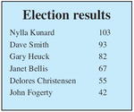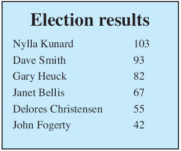by Alecia Warren Only an hour after the polls closed on Tuesday night, the votes for the two openings on the Town Council were tallied, with the two winners a mere few votes within one another. Incumbent Nylla Kunard garnered the most votes at 103, with Dave Smith right behind at 93. Both will serve four-year terms, starting on June 1.