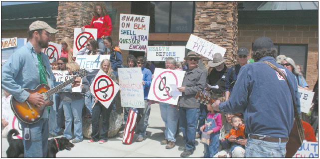 by Alecia Warren Sunday’s protest felt like a picnic as locals gathered outside the Bureau of Land Management (BLM) Pinedale Office. Children giggled and played at their parents’ feet while adults shared sandwiches and scribbled protest signs, or sat to the side tuning their guitars. “This is fun! It’s our right to speak in America!” declared Elaine Crumpley as she slapped people’s backs and dispersed hugs throughout the crowd. The petite school teacher had reason to beam as she studied the nearly 50 people gathered for the sit-in she had helped schedule, the activists varying from one and a half years old to 17 to the mid ‘80s. First meeting at the BLM facility before driving to protest with song and speeches on a Pinedale Anticline well pad, the protestors gathered to show their unity in the midst of intensifying energy development in Sublette County.